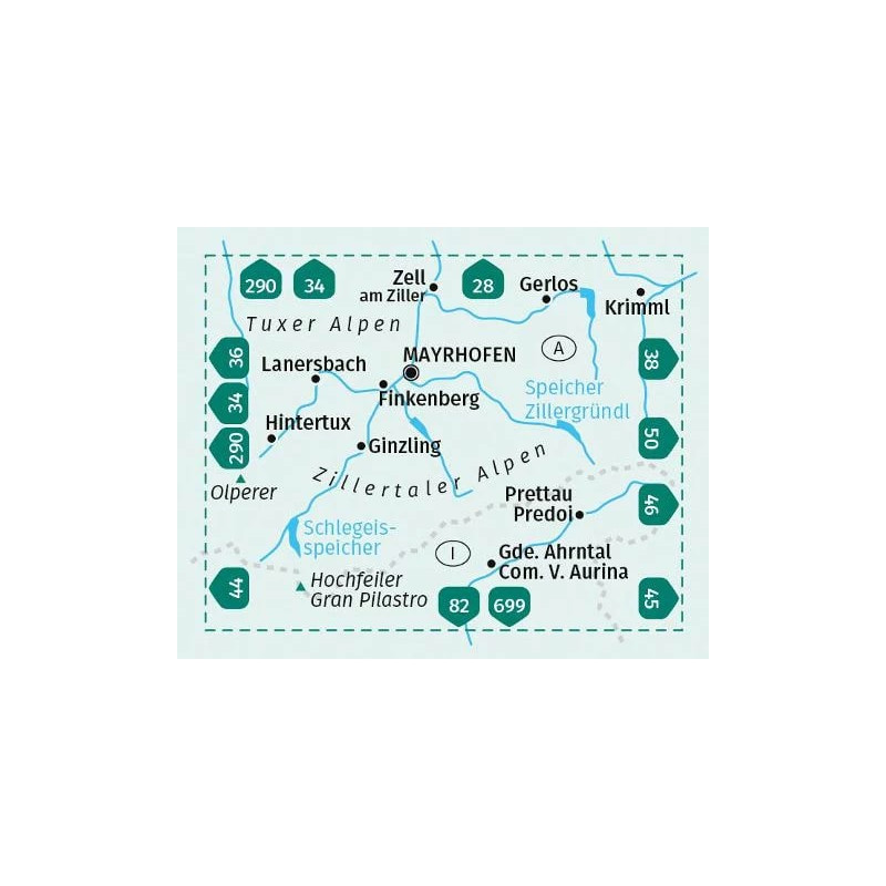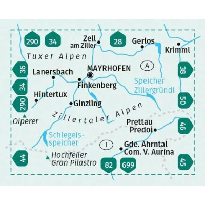 Carta escursionistica in scala 1:50000, relativa all'area alpina austriaca della Zillertal e Tuxertal.