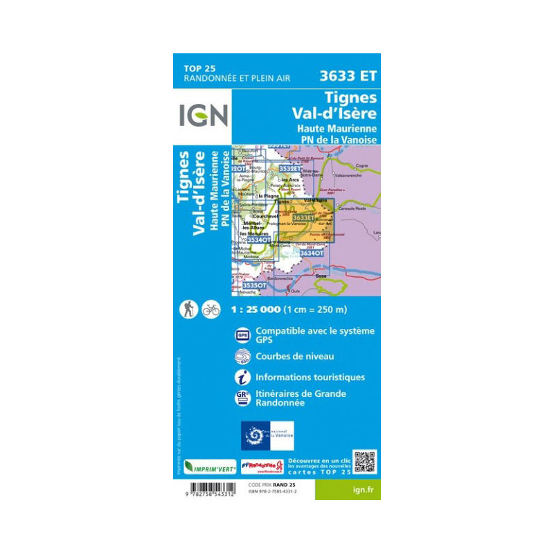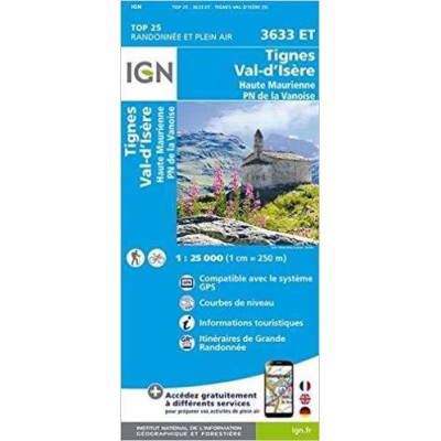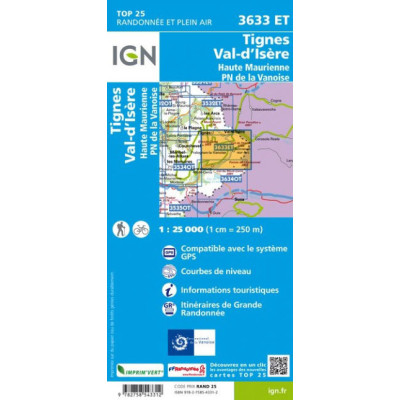 Carta escursionistica con curve di livello dell'Istituto Geografico Nazionale francese. Comprende la zona di Tignes, Val d'Isere, Haute Maurienne e il Parco Nazionale della Vanoise. La carta presenta reticolo UTM e informazioni turistiche.