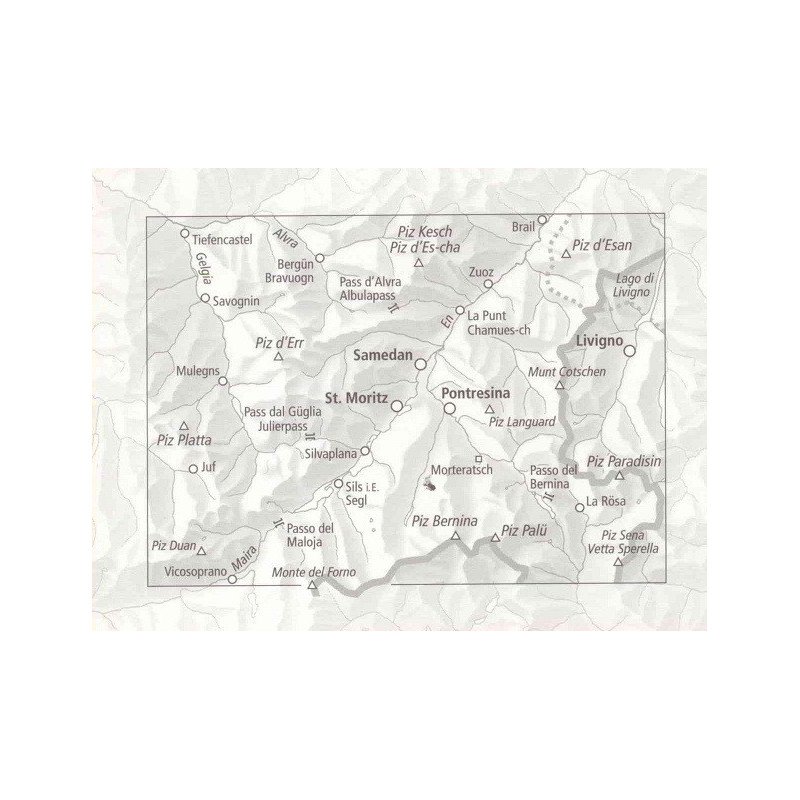 Carta escursionistica in scala 1:50 000 con reticolo UTM con tutti i sentieri segnalati, legenda e informazioni in tedesco, francese, italiano e inglese, che comprende la zona di Bergun, Piaz d'Esan, Livigno, Piz Palu, Piz Bernina, Pontresina, St Moritz